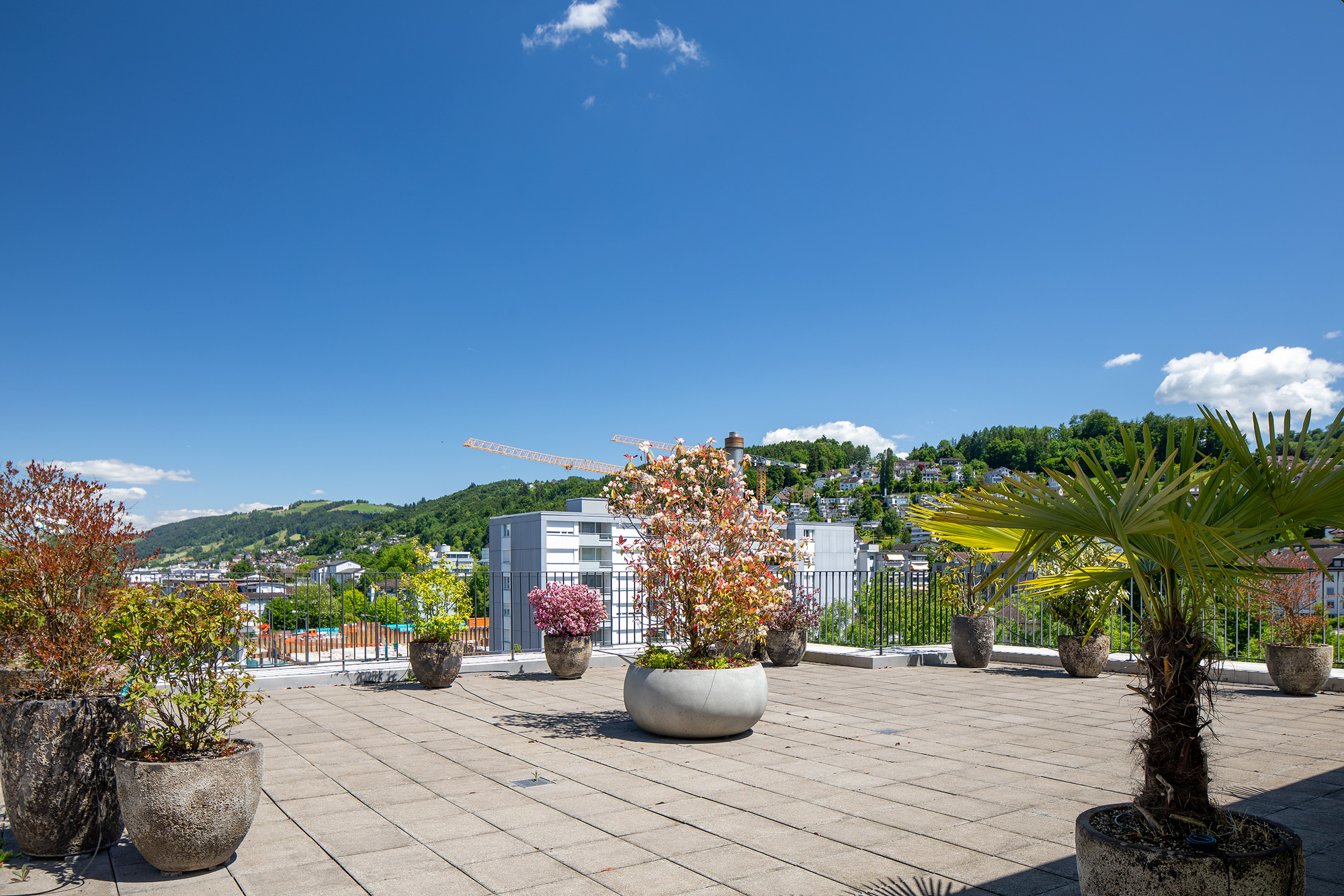 Freuen Sie sich auf die ca. 150 m² grosse Terrasse mit herrlicher Weitsicht sowie zusätzlichem Sitzplatz von 79 m² die zum Verweilen einladen.